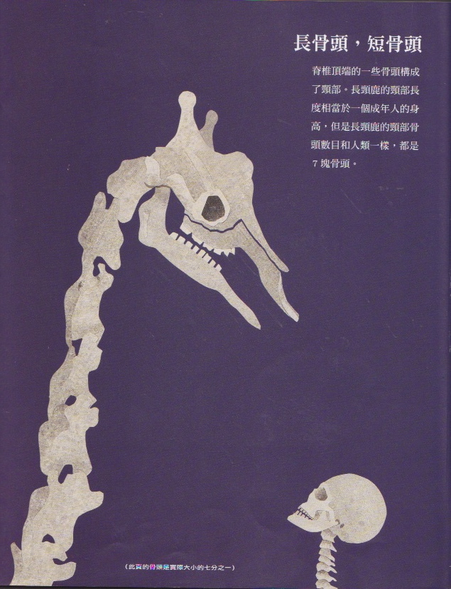 P.23這一張圖像,顯示出長頸鹿的頭部骨頭和頸部骨頭以及人的頭蓋骨和頸部骨頭。它的圖像要顯示的重點是長頸鹿的頸部骨頭有7根,人的頸部骨頭也有7根,但是,由於長頸鹿的頸部骨頭比較長,所以,相較之下,長頸鹿的頸部也就比較長了。從知識性的層面來看,就是顯示出長頸鹿的脖子比較長,但是創作者經營這個畫面時,讓長頸鹿的頭往下看,目光看向人頭,人頭則微微向上抬,長頸鹿和人似乎在聊天的氛圍,比較有故事性。如果將P.23這個圖像放在封面上,應該會比較有趣吧!
