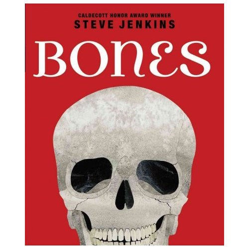 我注意到這本書的書名有英文書名「Bones」和中文書名「骨頭」,英文書名「Bones」排成一列,中文書名「骨頭」也排成一列。「Bones」排上面,「骨頭」排下面,而且,英文書名「Bones」和中文書名「骨頭」的中間是一排黑底白色的中文字,寫著「凱迪克獎得主 史提夫.詹金斯」這幾個字。一般圖畫書介紹作者和畫家,通常就是「文/某某某,圖/某某某」這樣的形式,而《骨頭》這本書特意使用「凱迪克獎得主 史提夫.詹金斯」,應該是要強調作者具有凱迪克獎得主的身份!