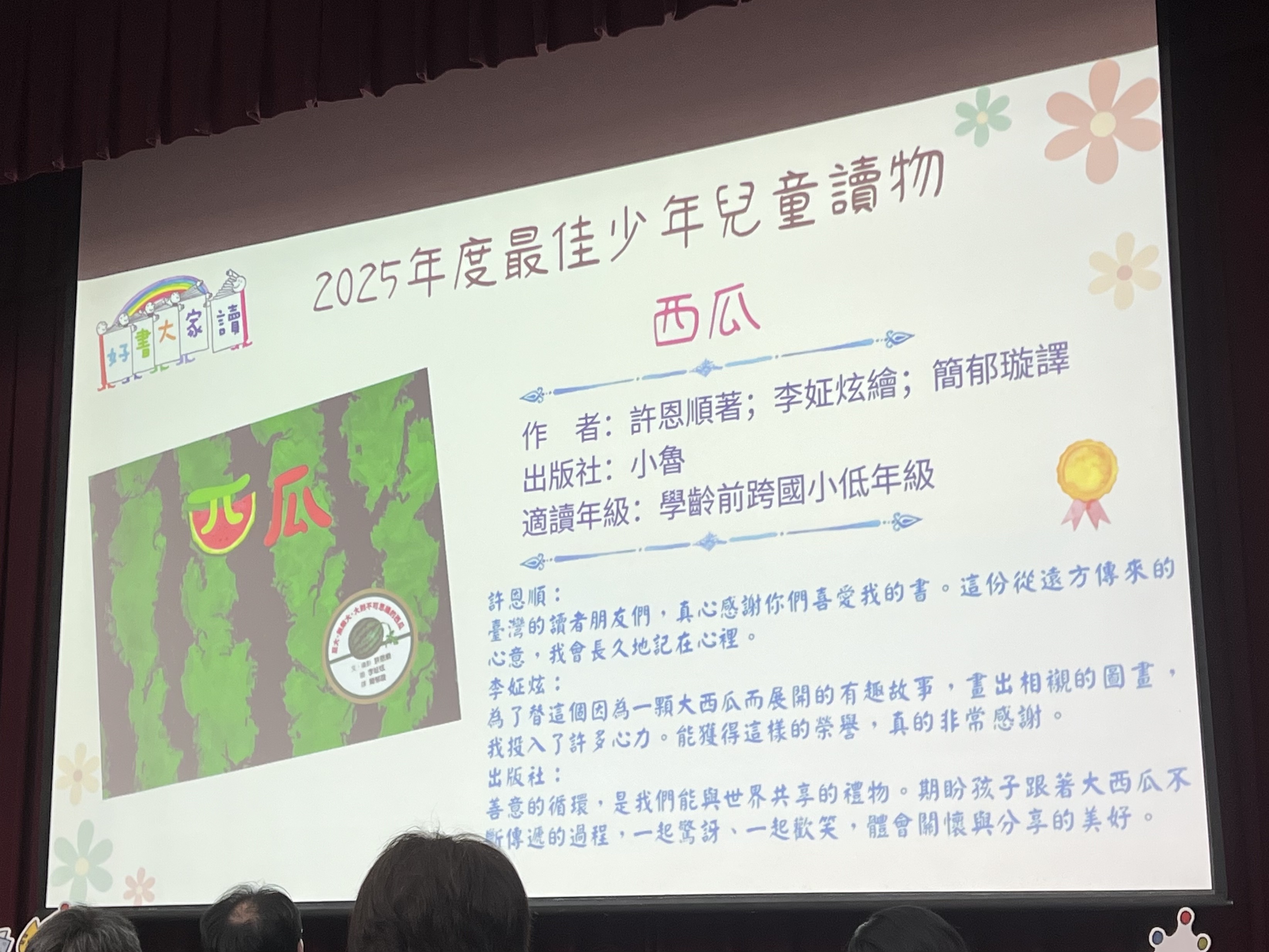 為了替這個因為一顆大西瓜而展開的有趣故事,畫出相襯的圖畫,我投入了許多心力。能獲得這樣的榮譽,真的非常感謝。