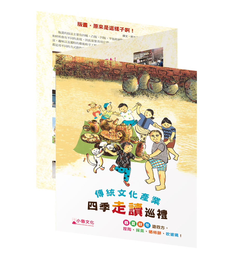 翻閱摺頁,四本繪本描繪的文化產業(陶器、茶園、柿餅、玻璃),無論是分布地區,或是產業發展簡介,一目了然;更搭配照片說明四種版畫技法的作法與特色,知性紙上之旅出發!