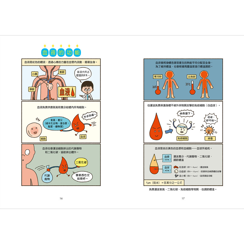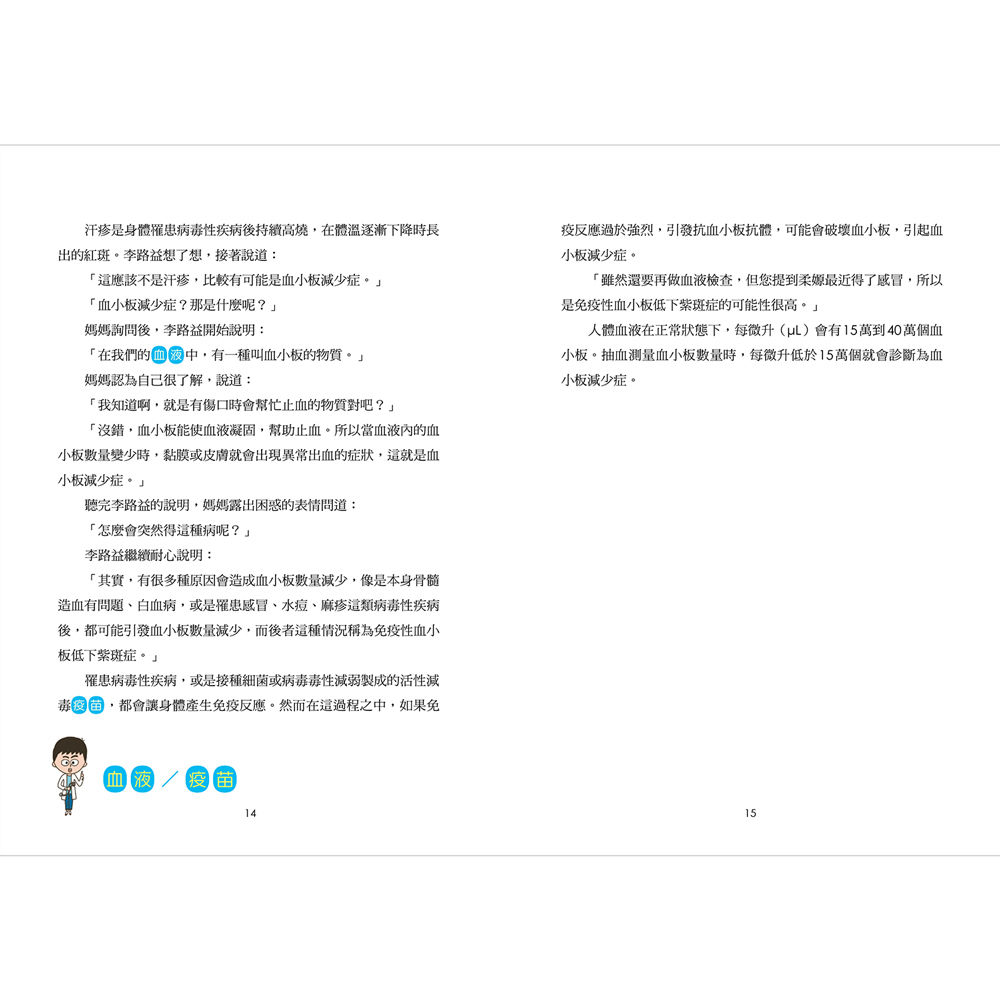 本集延續1~15集的故事情節,搭配「漫畫式知識站」的清晰圖解,建立關於血液疾病的重要觀念。從血液功能、血液循環與血型的基礎知識談起,介紹免疫性血小板低下紫斑症、白血病與貧血的成因,再認識骨髓穿刺檢查、白血球分離術、造血幹細胞移植、臍帶血與輸血等治療方式;同時透過案例帶出脾臟功能、鐵質重要性與臉色變化在疾病診斷中的角色,幫助大小讀者建立全面而實用的血液保健知識!