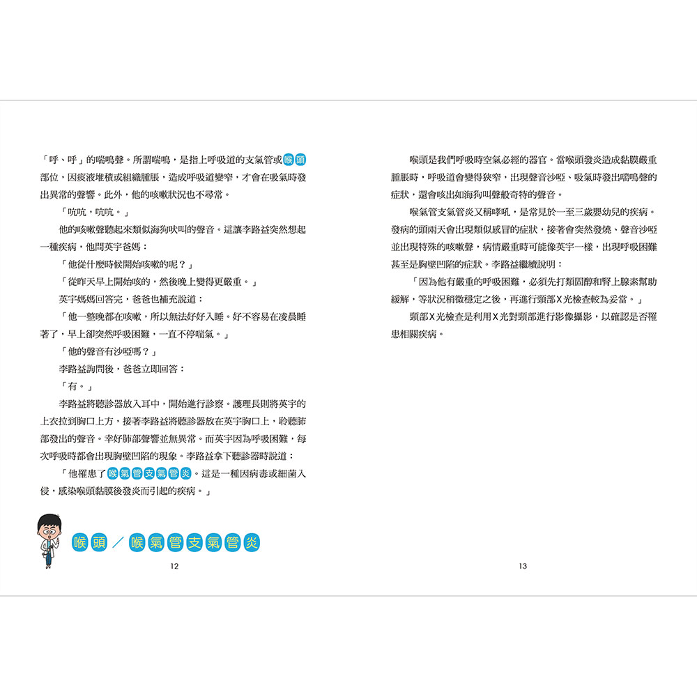 本集以耳鼻喉科疾病為主題,介紹喉氣管支氣管炎、顏面神經麻痺與中耳炎等常見疾病,並穿插變聲期、打鼾、噴霧治療器、耳鏡檢查等醫療與生活知識,建立完整的耳鼻喉保健知識。