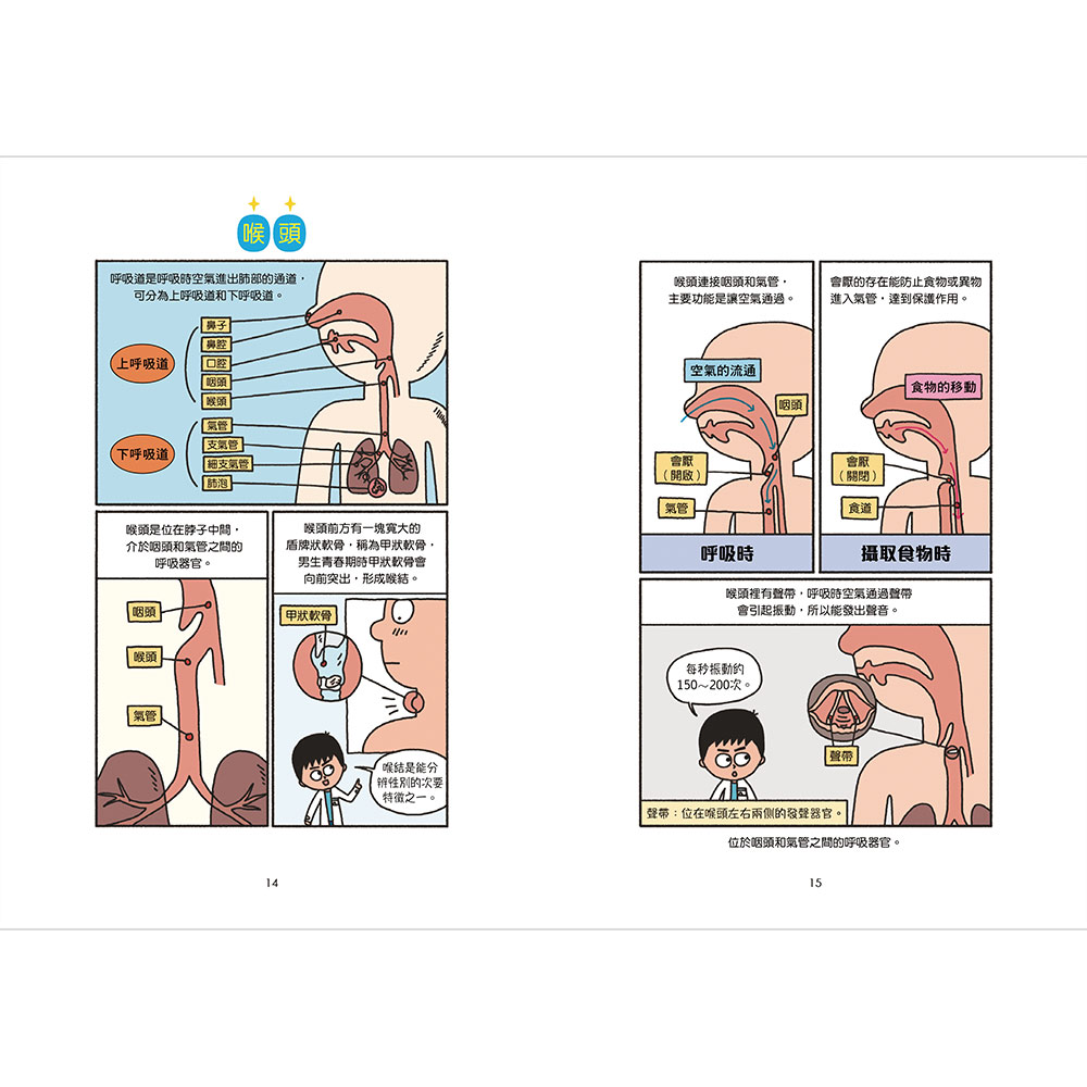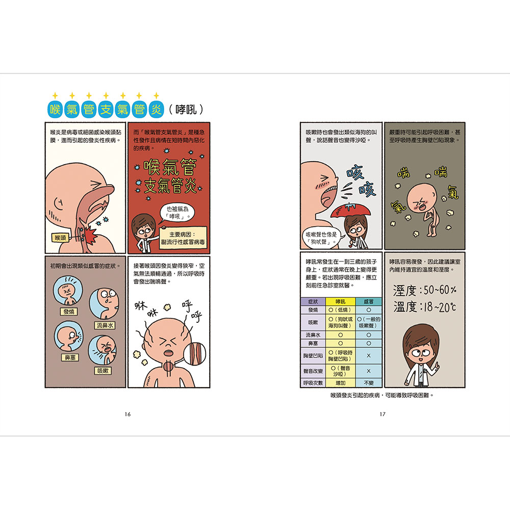 本集延續1~16集的故事情節,搭配「漫畫式知識站」的清晰圖解,建立關於耳鼻喉科疾病的重要觀念。從喉頭構造與聲音運作的基礎知識談起,說明喉氣管支氣管炎(哮吼)、扁桃腺與腺樣體肥大、顏面神經麻痺與中耳炎等常見疾病的成因,介紹噴霧治療器、耳鏡與內視鏡檢查、雷射手術、氧氣面罩等醫療處置,並穿插變聲期、打鼾、耳垢產生、頭暈原因與「腦袋一片空白」等生活中與耳鼻喉科相關的知識,幫助大小讀者建立實用的耳鼻喉健康觀念!