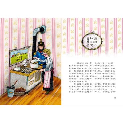 少了眼鏡,奶奶的眼前一片迷濛,什麼也看不清。不過有一點她還可以稍加辨認:這個闖進廚房的人穿著有銀鈕扣的藍外套,還佩戴著紅領章;他戴著頭盔,佩著大刀——這不是丁莫瑟警長又是誰呢?