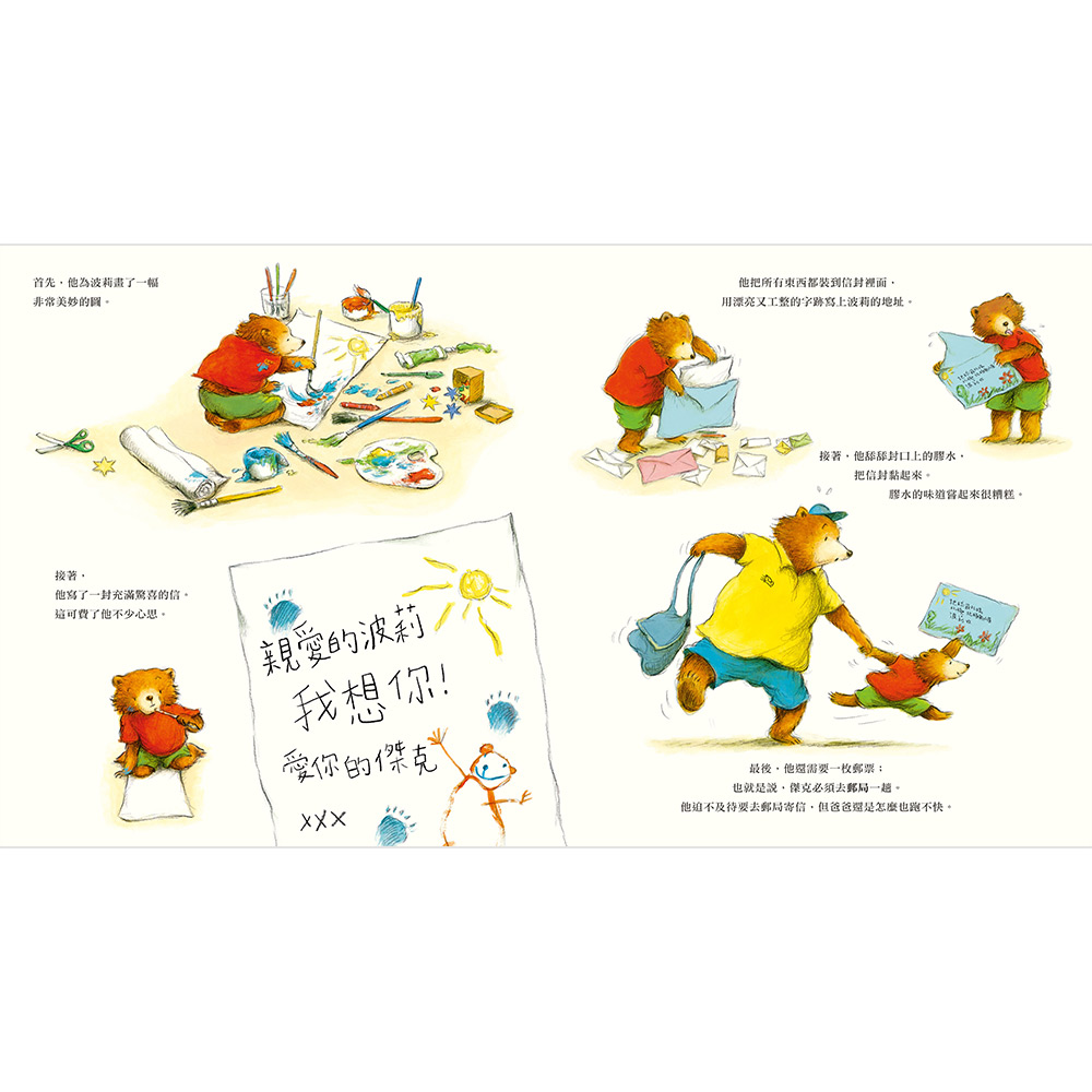 本書以溫暖逗趣的故事,帶領孩子展開一趟奇妙的書信之旅。小熊傑克想念遠在北極的好朋友波莉,在爸爸的陪伴下走進郵局,從寫信、貼郵票到投遞信件,一步步認識郵件寄送的流程。動物郵務士們分工合作,運用各種交通工具,使命必達地將滿載心意的信件送往世界各地。透過細節豐富的畫面與生動情節,孩子不僅能了解郵務士的工作內容,也能在閱讀中培養觀察力與邏輯思考,感受手寫書信所傳遞的溫暖與情誼。