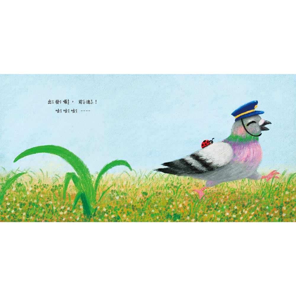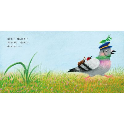 這是一本極具節奏感的可愛繪本!鴿子化身為專業司機,載著小瓢蟲、獨角仙、小青蛙等乘客前去散步。書中文字運用大量重複語句,如「出發囉,前進!」與「要停車囉!」,非常適合學齡前幼兒預測故事情節,並跟著預想下一頁的詞彙。