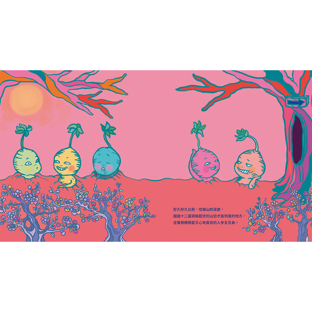 另外,這本繪本的螢光色彩運用超級吸睛!作者姜銀真運用了自己擅長的傳統版畫技法進行創作,將傳統風格結合現代元素,讓人參五兄弟與其他角色的各種表情更加生動——真的是又「醜」又超級可愛啦!!!