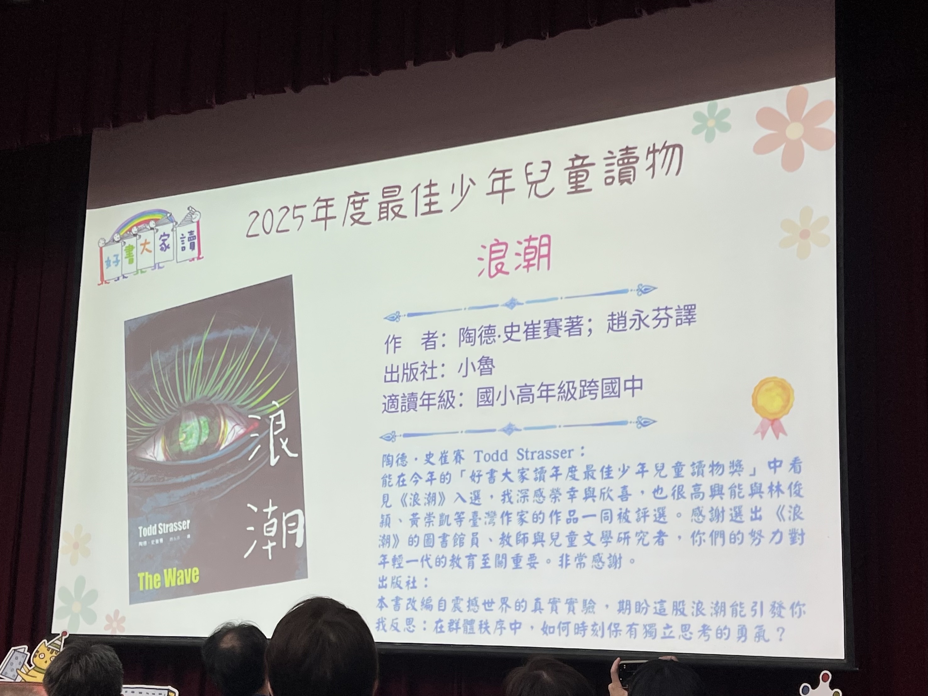 能在今年的「好書大家讀年度最佳少年兒童讀物獎」中看見《浪潮》入選,我深感榮幸與欣喜,也很高興能與林俊穎、黃崇凱等臺灣作家的作品一同被評選。感謝選出《浪潮》的圖書館員、教師與兒童文學研究者,你們的努力對年輕一代的教育至關重要。非常感謝。