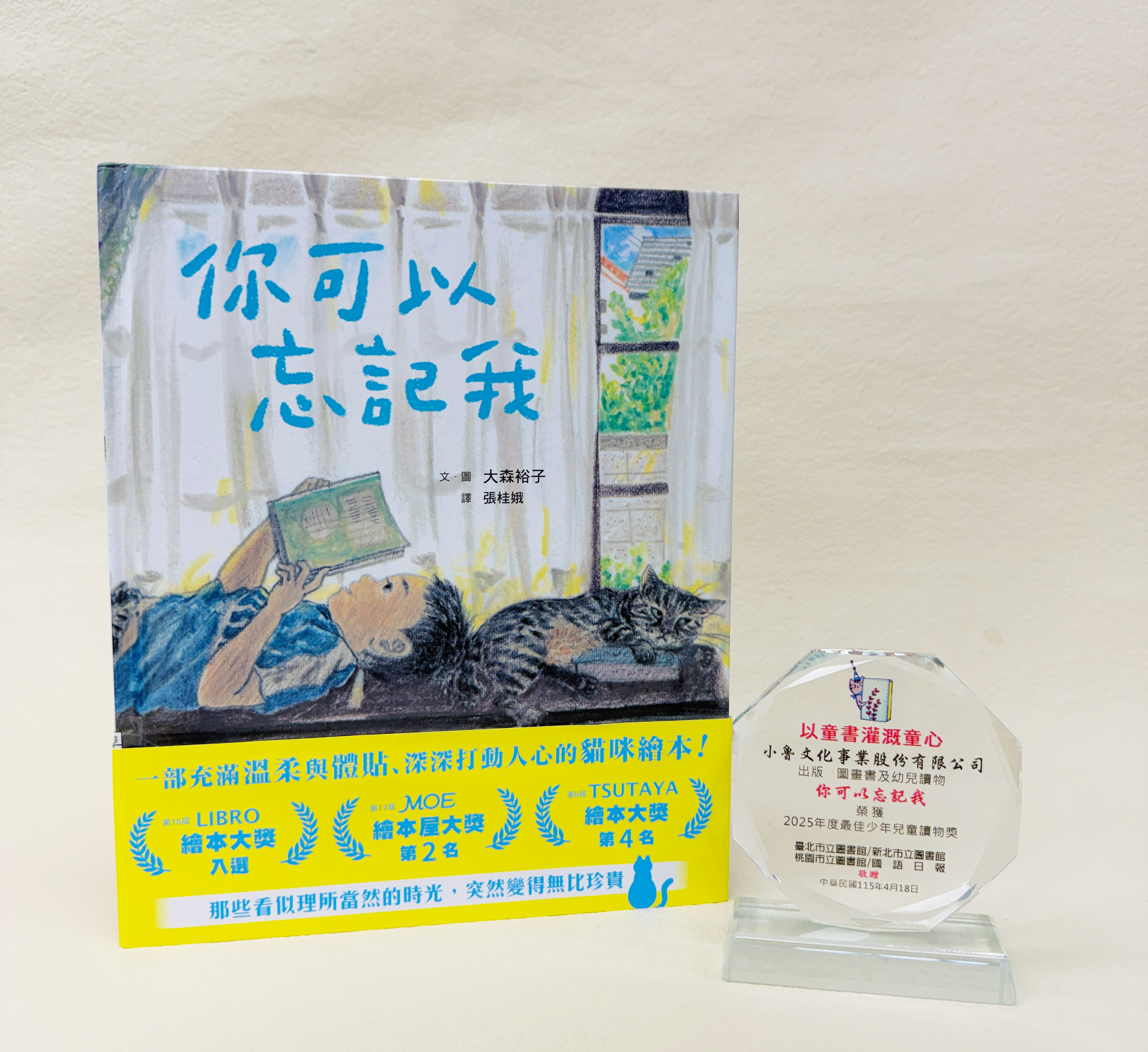 《你可以忘記我》是一個描寫從嬰兒時期起便一起成長的貓與男孩的故事。我將兩人長時間相伴、看似平凡卻如寶物般珍貴的日子,細細描繪在這本繪本之中。故事的原型,來自我的兒子與我們的愛貓。沒想到這樣的一本書,竟能在臺灣獲得如此美好的獎項,內心充滿感激。