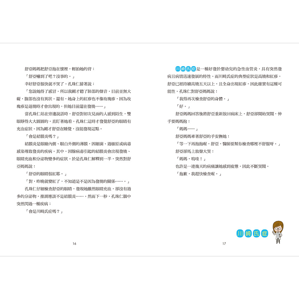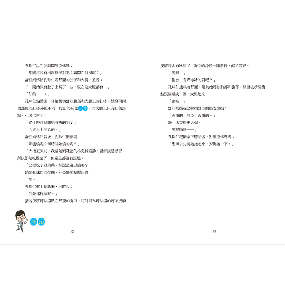 針對故事提及的醫學關鍵字進行解說,以圖表搭配文字清晰解析科學概念、醫療知識及相關歷史演進等,易理解、易吸收卻有一定深度,讓孩子輕鬆學習新知,奠定醫學觀念的基礎。