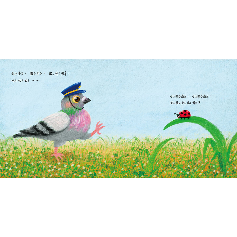 這是一本極具節奏感的可愛繪本!鴿子化身為專業司機,載著小瓢蟲、獨角仙、小青蛙等乘客前去散步。書中文字運用大量重複語句,如「出發囉,前進!」與「要停車囉!」,非常適合學齡前幼兒預測故事情節,並跟著預想下一頁的詞彙。