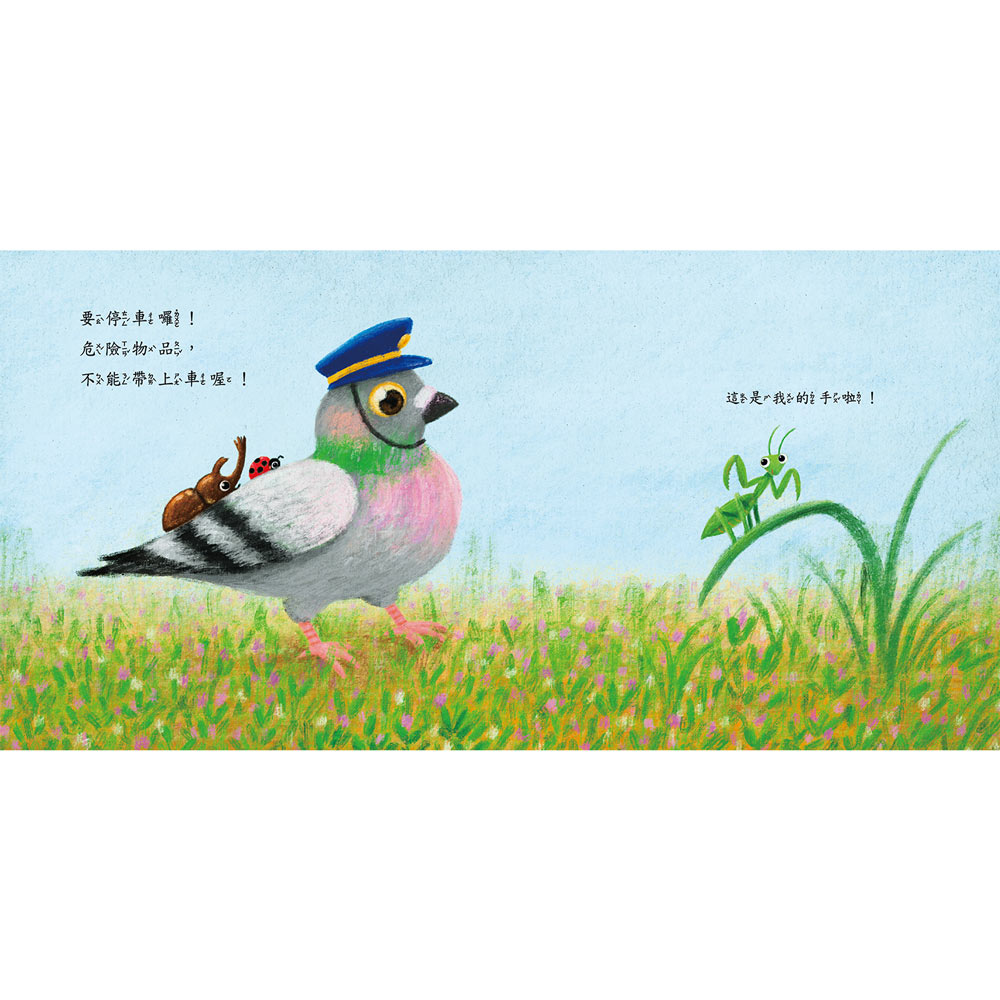 呆萌表情的鴿子車長,也像極了喜歡模仿大人的幼兒;而鴿子揹著乘客的畫面,是不是很像寶寶與父母玩的「背上遊戲」呢?書中將螳螂鐮刀誤認為「危險物品」的對話,皆展現了作者田中伸獨特的幽默童趣。